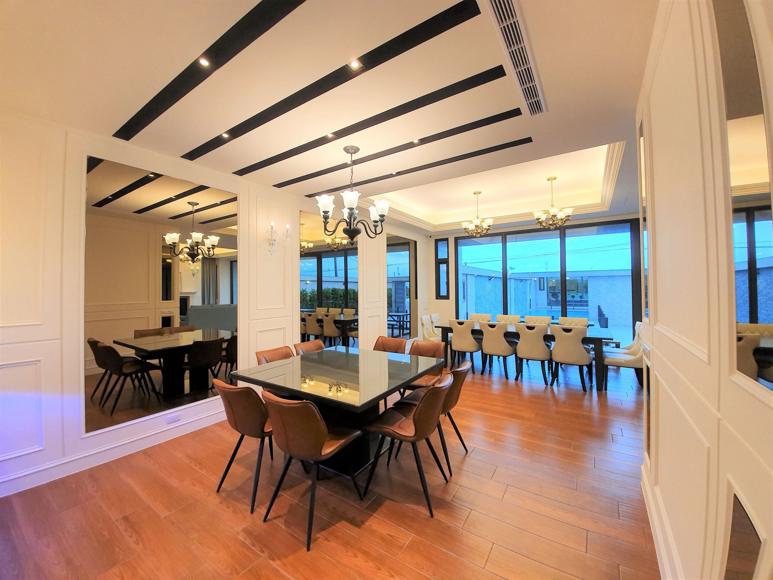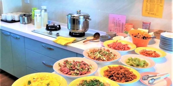 都有寬長的豪華餐廳,可以一起吃早餐、火鍋、消夜等。晚上還可以一起聊天、打牌、玩桌遊