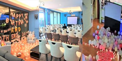 企業如有會議需求,可以協助您一同擺設成簡報setup、會議setup等,這邊亦有4萬元企業級的專業投影機與80+吋大型背幕可以便宜預約租借 (僅800元)。如有求婚/生日擺設可開放氣球公司布置,遵守現場布置規定即可